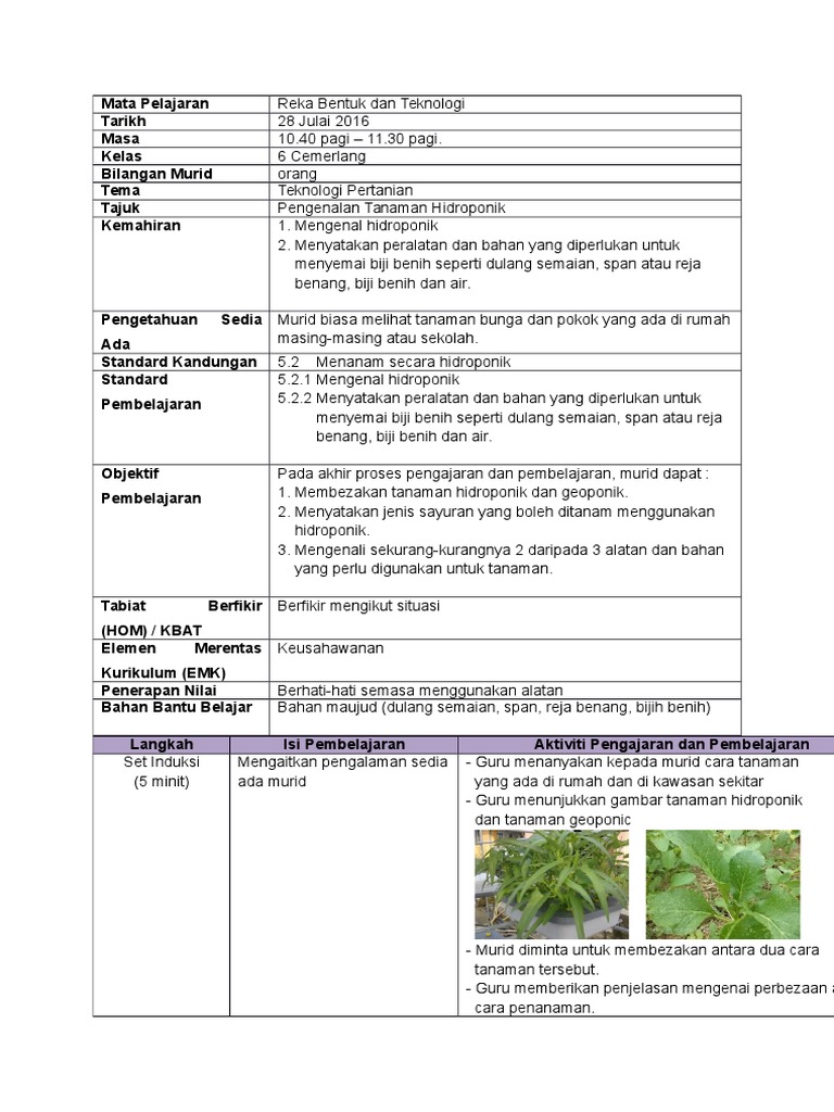 Tuang air anggaran 16 18 liter bagi sebuah takung 29 liter. Reka Bentuk dan Teknologi KSSR tahun 6 Lampiran 2 Pengenalan Hidroponik Menanam secara hidroponik adalah kaedah penanaman yang menggunakan larutan nutrien di dalam air tanpa menggunakan tanah. Teknologi Pertanian Hidroponik Tahun 6 DRAFT.